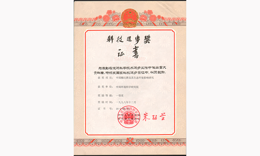 199812月,我院牽頭的“中國酸沉降及其生態(tài)環(huán)境影響研究”榮獲國家科學(xué)技術(shù)進(jìn)步獎一等獎。